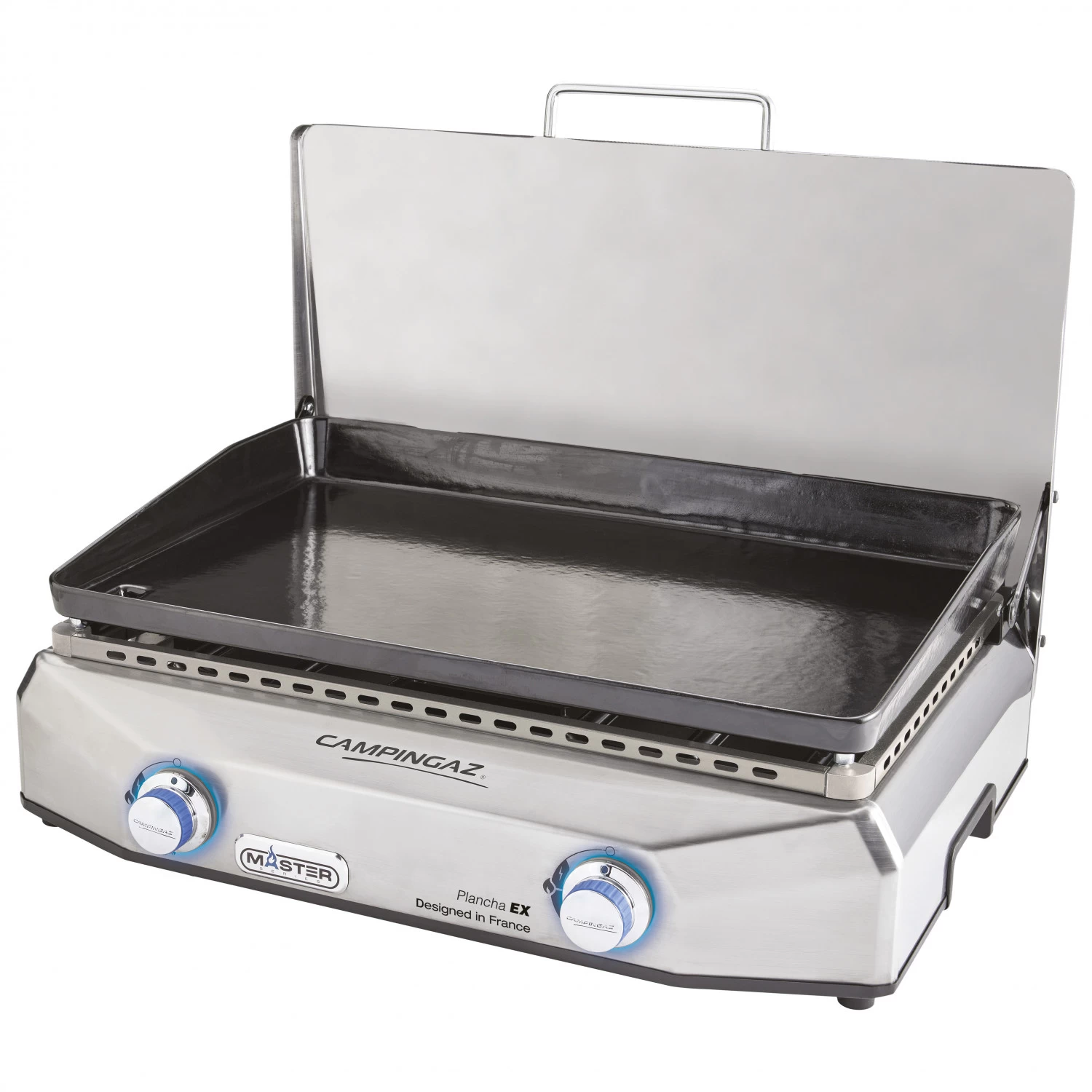 Mit der Master Plancha EX von Campingaz grillst Du auf wie der reinste mediterrane Meister! Das sauber designte Gehäuse aus Edelstahl und die gusseiserne Grillplatte wirken schon optisch beeindruckend, können aber natürlich auch einiges. Die patentierte Blue Flame– Technologie bringt den Grill schnell auf Temperatur und erhitzt die Platte gleichmäßig, wobei die Brenner durch einfaches Drehen der blau beleuchteten Regler entzündet werden. Auch die Reinigung ist ein Kinderspiel: Fett und Nahrungsreste werden durch den Abfluss in einer Ecke in den seitlichen Fettauffangbecher abgeleitet, und dieser kann einfach in der Spülmaschine gereinigt werden. Während des Grillens fungiert der Edelstahldeckel als Windschutz.