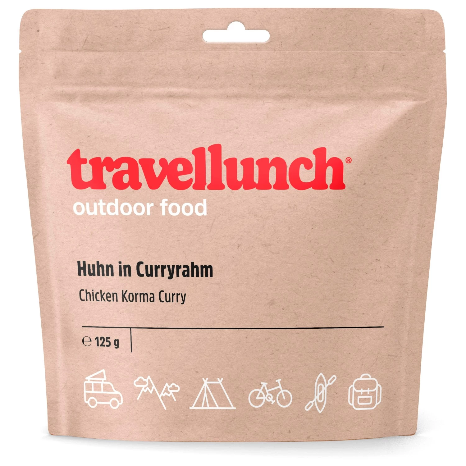 Ideal für Touren, bei denen jedes Gramm ins Gewicht fällt: Outdoor Nahrung von Travellunch, für eine ausgewogene Ernährung on Tour! Um nach anstrengenden Tagen in Bergen, Gletschern oder am Kletterfels wieder zu Kräften zu kommen, bietet Travellunch vollwertige Mahlzeiten aus gefriergetrockneten Zutaten, die durch geringes Gewicht und Volumen punkten. Neben abwechslungsreichen Hauptgerichten gibt es auch Frühstück, Desserts und Getränke. Die Gerichte sind geschlossen und ungekühlt für ca. 2 Jahre haltbar und lassen sich einfach zubereiten: angegebene Menge heißes Wasser in die Packung geben, verschließen und einige Minuten ziehen lassen (genaue Zeit ist auf der jeweiligen Verpackung angegeben) – fertig! Das Huhn in Curryrahm mit Reis gibt’s als 125 g (ergibt ca. 500 g) und 250 g (ergibt ca. 1000 g) Packung. Die große Packung ergibt zwei kleine Portionen. Bei großem Hunger oder hohem Energiebedarf sollte man aber doch eine komplette 250 g Packung pro Person rechnen! Nährwerte pro 100 g: 1660 Kj/ 394 Kcal. Zutaten: Reis, Stärke (z. T. modifiziert), Hühnerfleisch (9%), Ananas, Sahnepulver (7%), Butterpulver, Sultaninen, Mandeln, Molkenerzeugnis, Hühnerbrühe, Maltodextrin, Salz, Fett pflanzlich gehärtet, Aromen, Gewürzextrakte, Farbstoff: ß-Carotin. Enthält: Gluten, Sellerie.